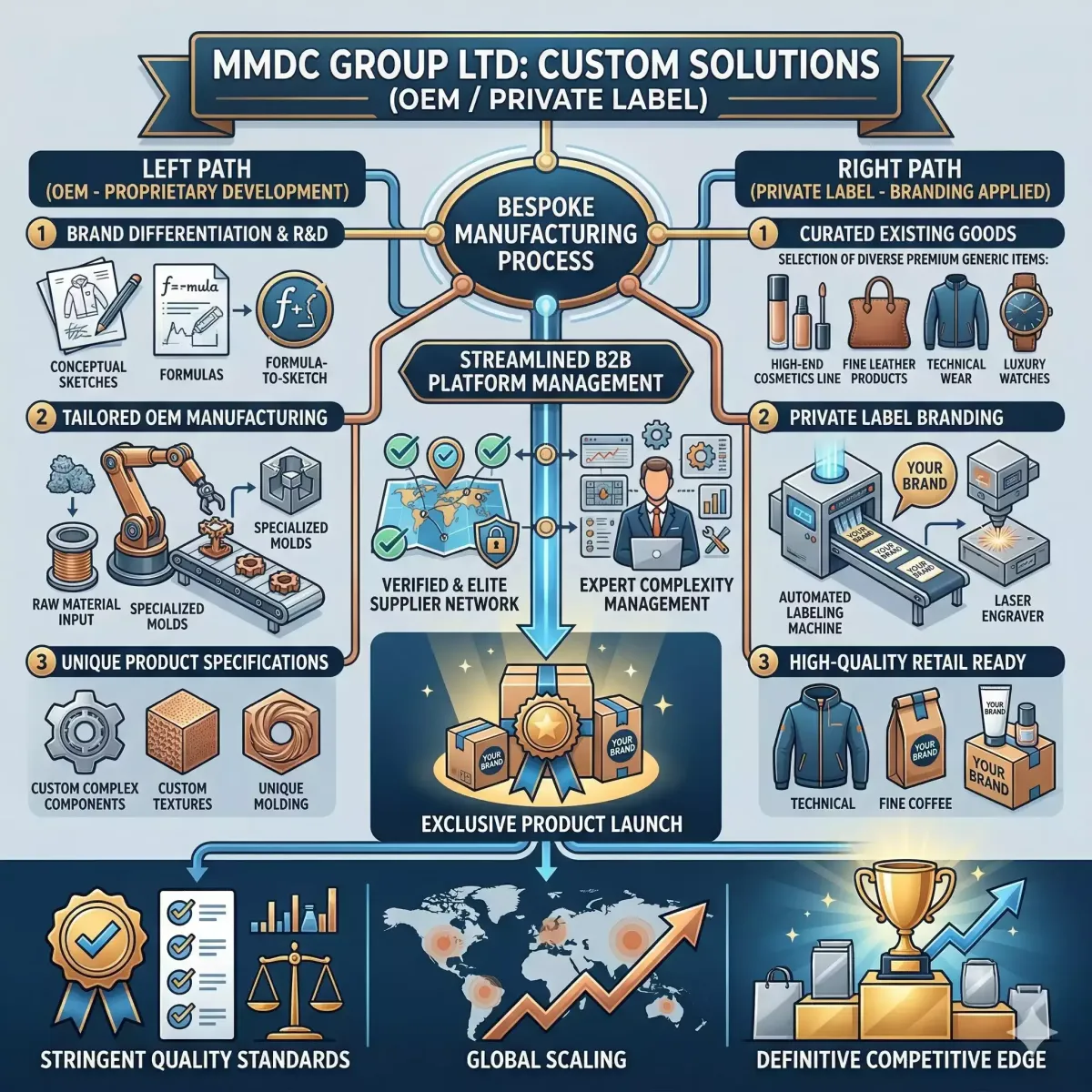 Understanding that true brand differentiation requires bespoke manufacturing, MMDC Group Ltd offers comprehensive Custom Solutions, including tailored OEM and Private Label services. We leverage our extensive network of verified, elite suppliers to produce goods that align perfectly with your brand's unique specifications and stringent quality standards. Whether you are developing a proprietary product line from scratch or applying your branding to high-quality existing goods, our robust B2B platform streamlines the entire process from initial sourcing to final production. By expertly managing the complexities of custom manufacturing, we empower you to launch exclusive products confidently, scale your brand globally, and maintain a distinct competitive edge in your market.