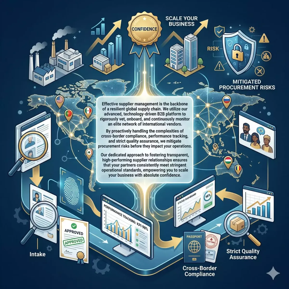 Effective supplier management is the backbone of a resilient global supply chain. We utilize our advanced, technology-driven B2B platform to rigorously vet, onboard, and continuously monitor an elite network of international vendors. By proactively handling the complexities of cross-border compliance, performance tracking, and strict quality assurance, we mitigate procurement risks before they impact your operations. Our dedicated approach to fostering transparent, high-performing supplier relationships ensures that your partners consistently meet stringent operational standards, empowering you to scale your business with absolute confidence.